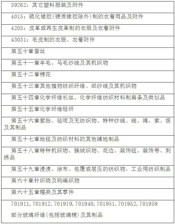 此次美方的建议征税清单涵盖6031个税号,其中纺织服装产品税号达1000余个,涉及绝大部分纺织原料、半成品以及少量服装附件产品,主要包括纺织原料(棉花、丝、毛、麻等);纱线和面料(棉、毛、丝、麻、化纤、玻璃纤维等制);地毯;工业用纺织品;皮革和毛皮服装、帽类及手套、塑料雨衣等。中国对美出口额较大的梭织服装、针织服装和家用纺织制成品等商品未列入清单。 涉及产品包括(仅指纺织服装统计项下产品):
