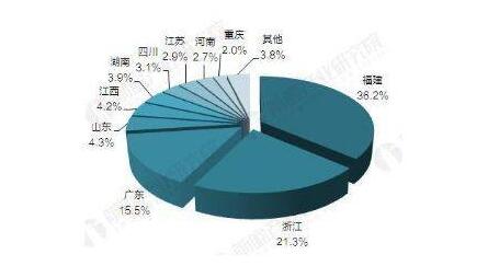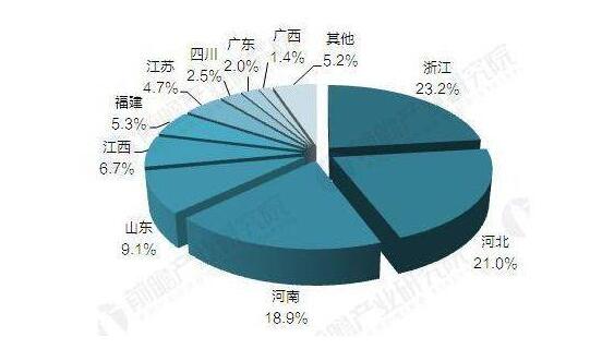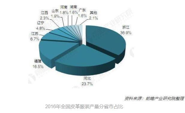 从产品用途来看,中国皮革产品用于皮鞋和服饰为主,分别占到35%和20%,超过一半的皮革制品用于这两类成品。如下图所示浙江省在皮鞋产量中位居第二,在服饰产量中位居第一。2015年,全国规模以上皮革行业共有8114家企业,浙江省也以1728家的数量位居第一。