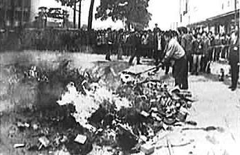 1987年8月8日,杭州武林门广场前被查抄的伪劣温州鞋堆积成一座小山,愤怒的杭州人点起大火,将5000多双皮鞋付之一炬,冲天的烟雾和刺鼻的气味笼罩在广场上空久久未散去。