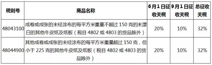 此外,9月1日及12月15日加征关税的名单中,还涉及与6月1日重复加税的48043100和48044900两个税则号。两个税则号6月份关税为20%,9月份加征关税10%,总关税为32%。