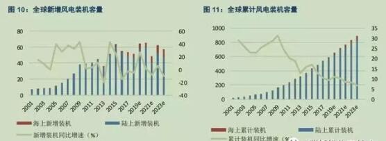 风电装机容量不断增长,将成为全球主体电力之一。预计2019至2050年全球发电资产新增投资将达到13.3万亿美元,其中风电占比最高,约为40%;到2050年风电、光伏两类可再生能源发电量占比接近全球发电量一半,其中风电占比由2018年的5.5%增长至26%,成为全球主体电力之一。