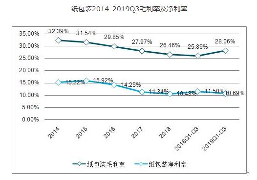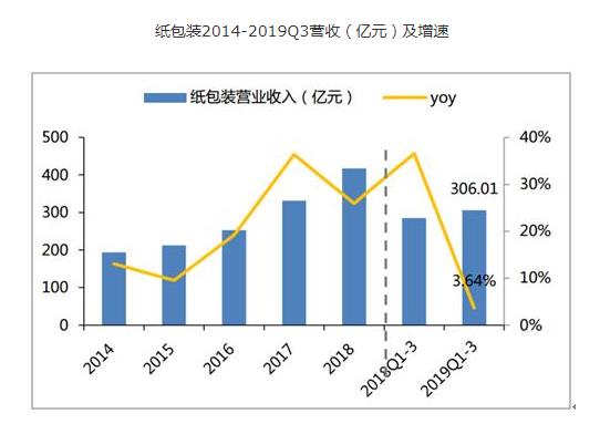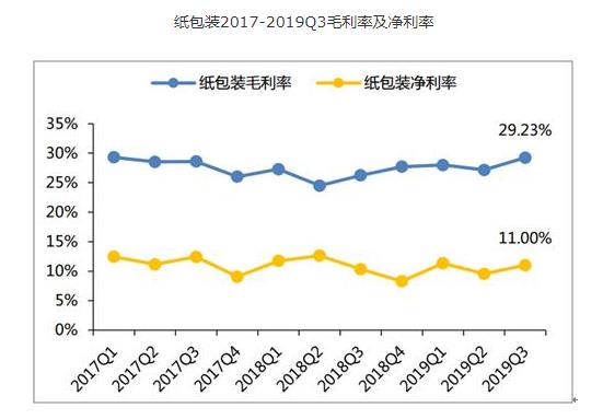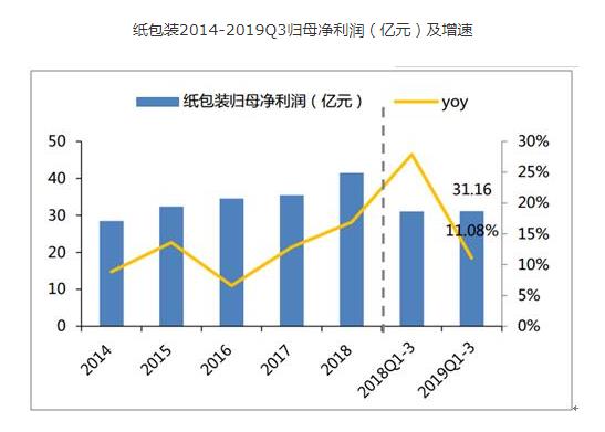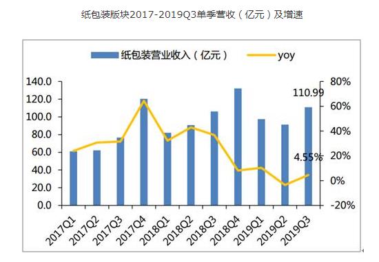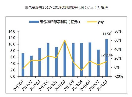2019Q1-3纸包装板块实现营业收入306.01亿元,同比+3.64%;实现归母净利润31.16亿元,同比+11.08%。