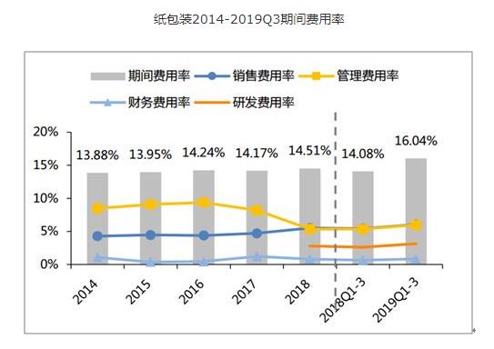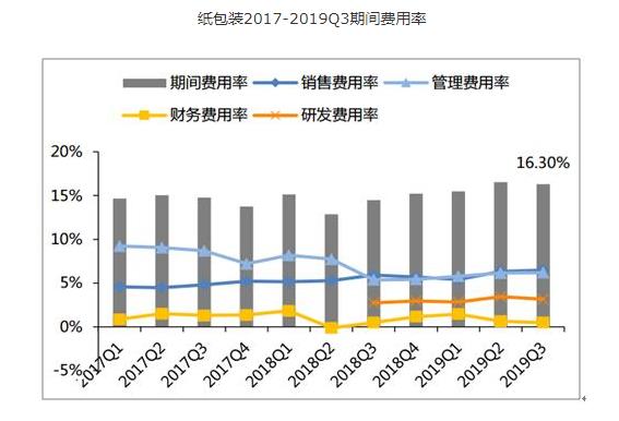 2019Q1-3纸包装子版块毛利率同比+2.17pcpts至28.06%,净利率同比-0.80pcpts至10.69%。期间费用率同比+1.95pcpts至16.04%,其中销售费用率同比+0.62pcpts至6.06%;管理费用率同比+0.64pcpts至5.99%;财务费用率同比+0.17pcpts至0.84pcpts;研发费用率同比+0.52pcpts至3.14%。