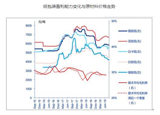 盈利能力改善系:1)原材料价格回落:2018Q2各纸种价格较高,2019Q2各纸种价格明显同比回落(铜版纸、双胶纸、白卡纸、白板纸、箱板纸同比下降19%、14%、13%、12%和20%),考虑到原材料库存周期,2019Q3行业盈利能力有望继续环比提升。2)行业整合话语权提升:纸包装行业持续整合,如箱板瓦楞纸龙头合兴包装订单量逆势持续增长,行业整合推动行业盈利水平触底回升。3)提升价值链附加:以纸包装为载体为品牌商提供高附加值服务,提升整体毛利率,例如吉宏股份以包装为载体,跨界拓展精准营销与跨境电商,实现线上广告和线下包装业务的深度融合。