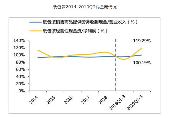 2019Q1-3纸包装板块实现销售现金流306.60亿元,同比+12.75%,销售现金流/营业收入同比+4.79pcpts至100.19%;实现经营性现金流39.04亿元,同比+35.04%,经营性现金流/净利润上升31.09pcpts至119.29%,现金流表现优秀。